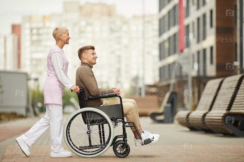 Содержание привлекательная квалифицированная медсестра в форме гуляет с больным-инвалидом по городу, она толкает инвалидное кресло с мужчиной