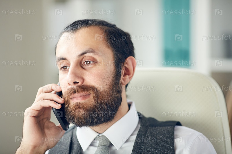 Близкий план серьезного занятого мужского менеджера проекта с бородой, сидящего на офисном стуле и общающегося по мобильному телефону