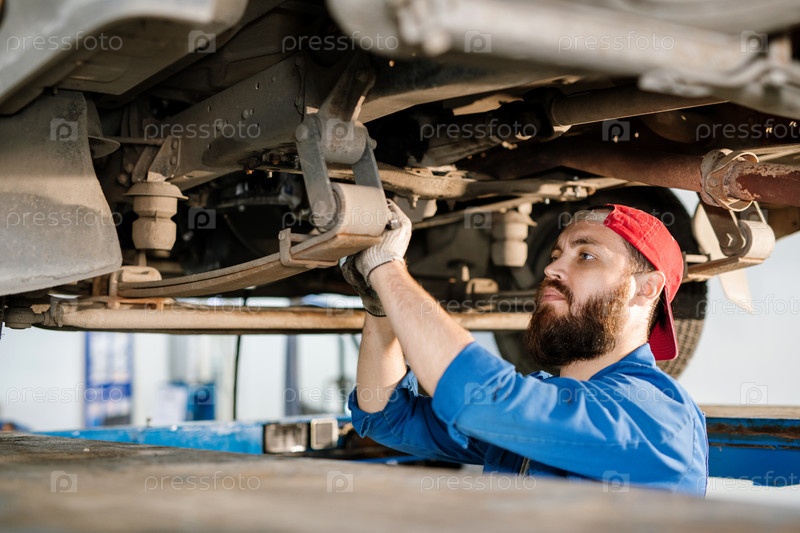 Молодой бородатый техник службы по ремонту машин фиксирование деталей