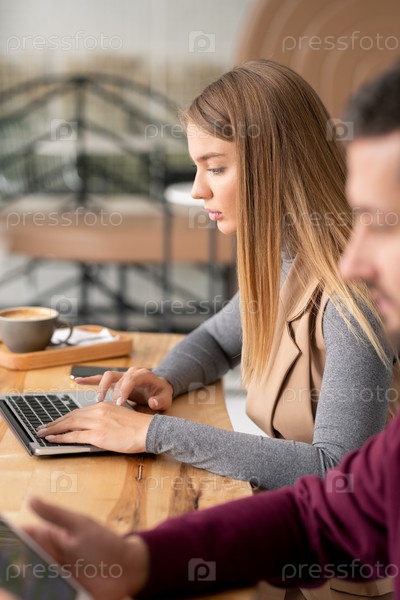 Серьезная бизнесвумен концентрируется на сети, сидя у ноутбука