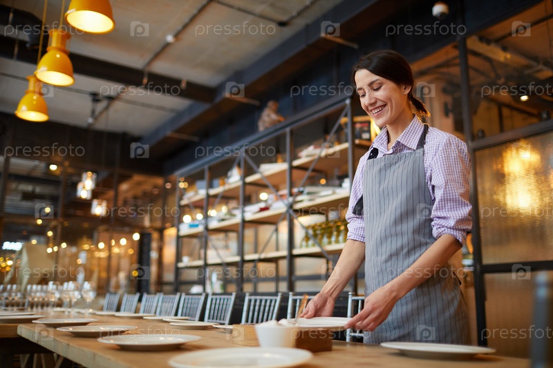Улыбающаяся официантка обслуживает стол в кафе