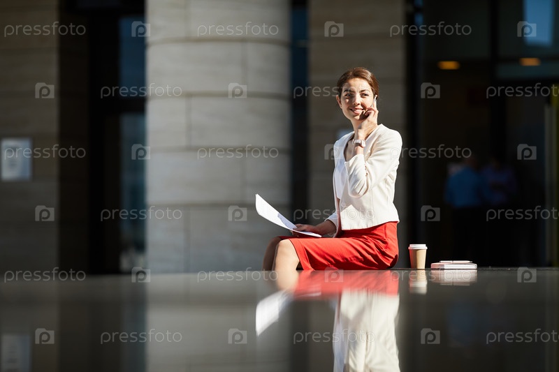 Улыбающаяся деловая женщина, разговаривающая по телефону на солнце