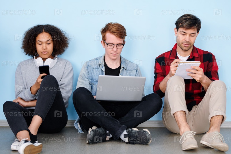 Трое молодых товарищей по группе с гаджетами и ноутбуком работают индивидуально
