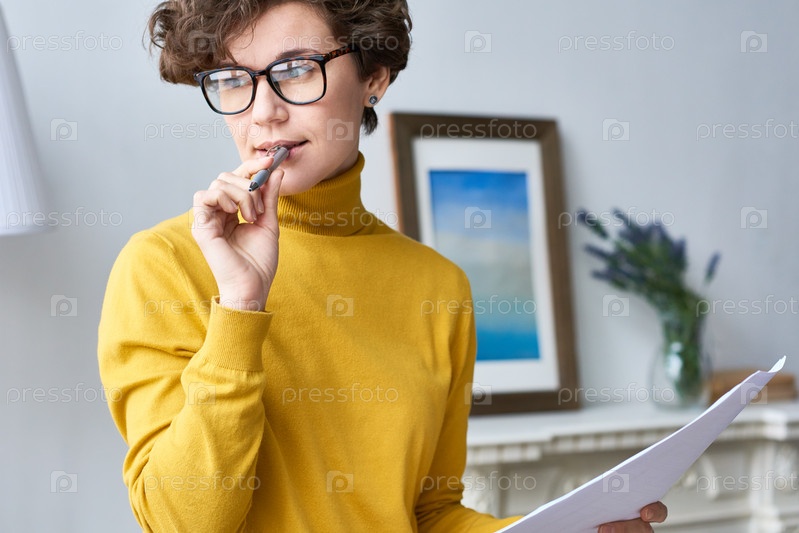 Пенсивная женщина анализирует отчет