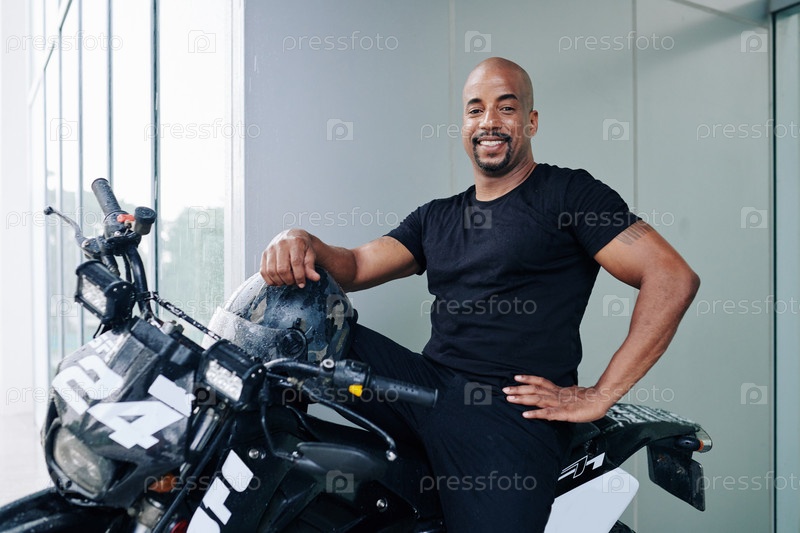Счастливый уверенный мужчина, сидящий на мотоцикле