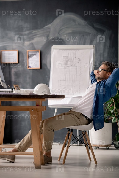 Расслабленный инженер сидит на стуле у стола и смотрит видео на экране компьютера
