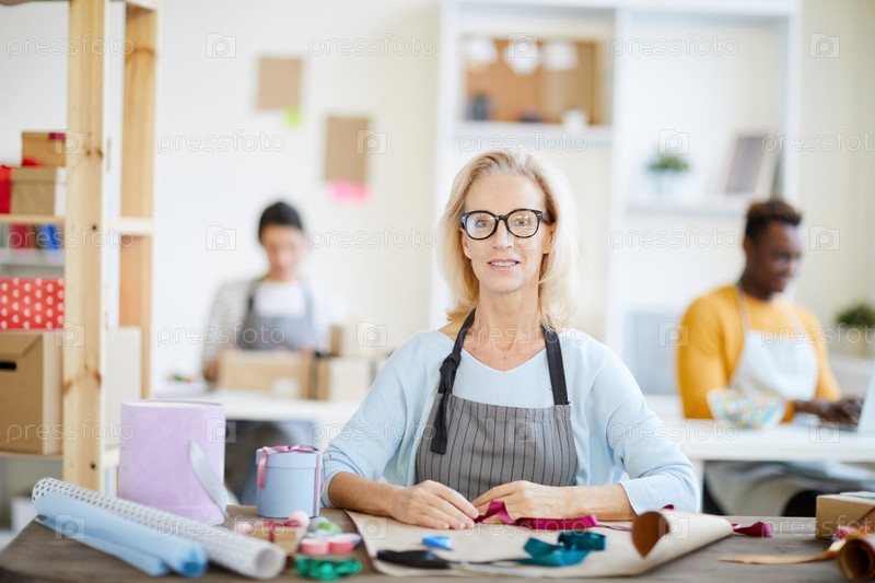 Улыбающаяся привлекательная зрелая леди в очках, одетая в раздетый фартук сидит за столом с лентами и оберточными бумагами и смотрит на камеру в подарочной мастерской