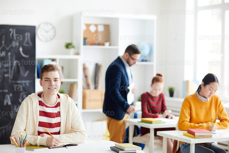 Улыбающийся красивый молодой студент-мужчина в капюшоне сидит за столом и смотрит на камеру, сдавая экзамены в классе