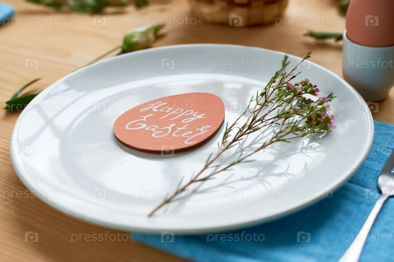 Близкий план рождественской открытки с счастливыми пасхальными буквами и цветущей ветвью на тарелке, идея Пасхи для установки стола