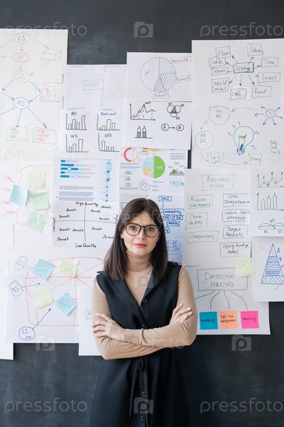 Молодой экономист стоит у доски с диаграммами потоков и схемами на бумагах