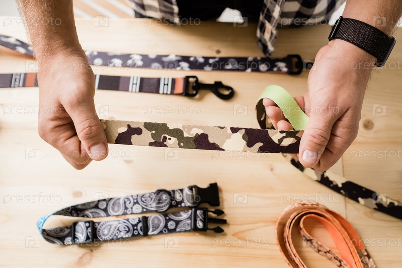 Обзор рук ремесленника, держащего одну из творческих запчастей для ошейника