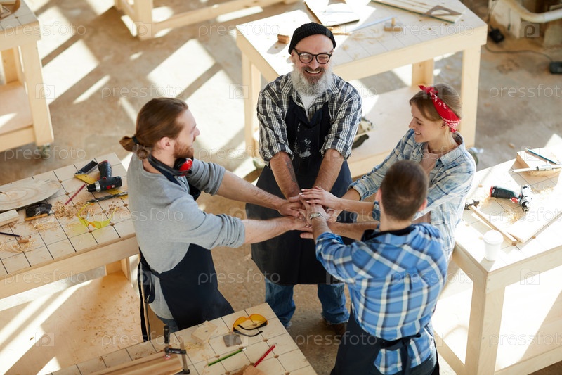 Группа счастливых плотников в рабочей одежде, стоящих в кругу и складывающих руки вместе, поддерживая друг друга