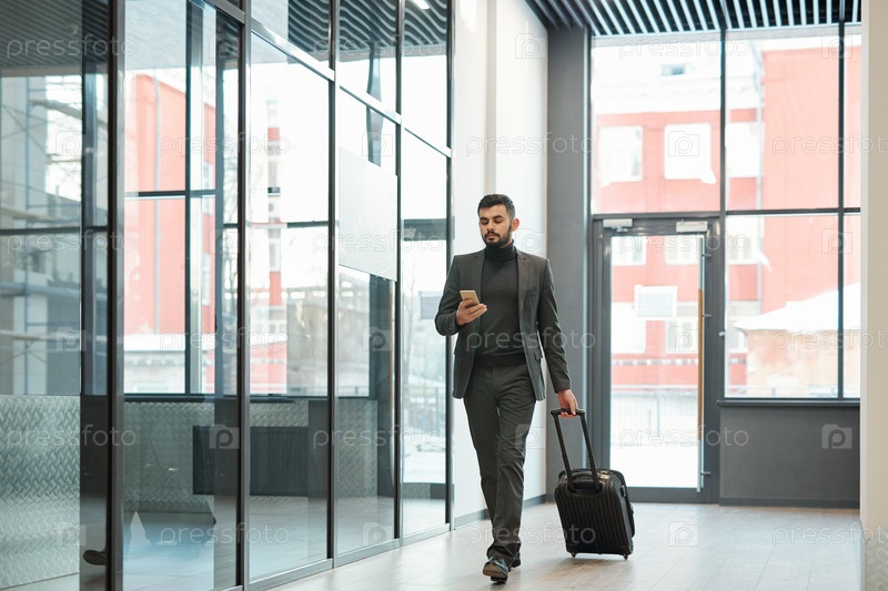 Молодой элегантный бизнесмен прокручивает смартфон, двигаясь вдоль аэропорта