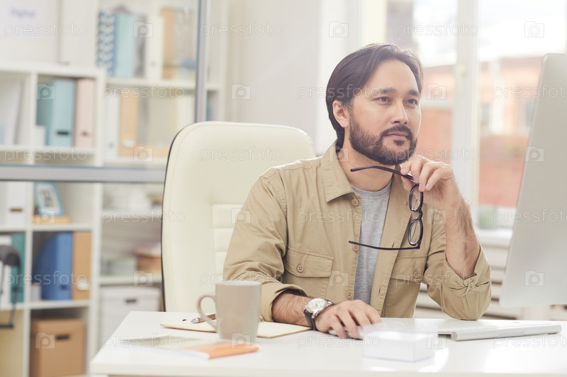 Серьезный вдумчивый молодой азиатский программист сидит за столом и держит очки, создавая дизайнерское решение