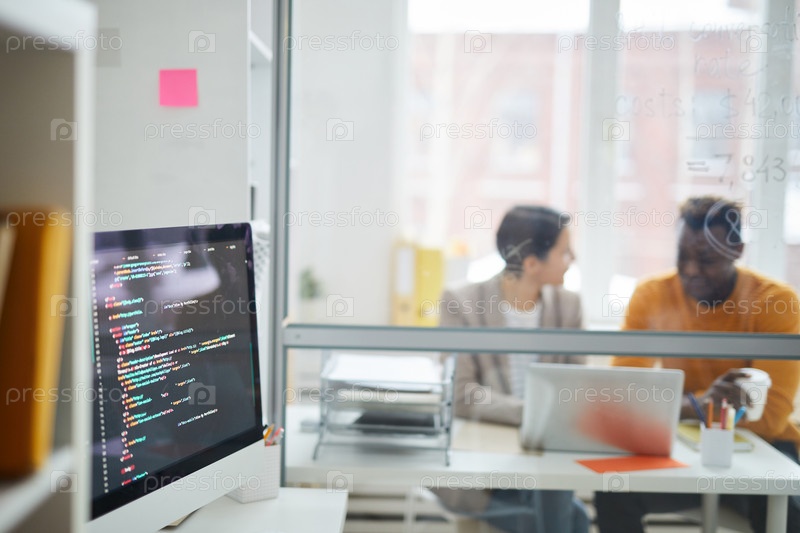 Офис программистов: сосредоточьтесь на компьютерном мониторе с скриптом java, молодые многоэтнические коллеги используют ноутбук и обсуждают проект в фоновом режиме