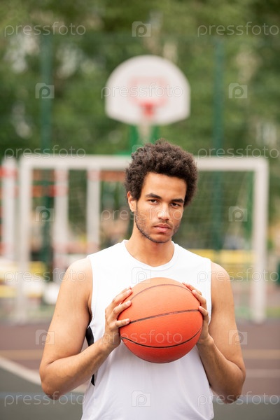 Молодой межкультурный баскетболист в белом футболке, держащий мяч за грудь
