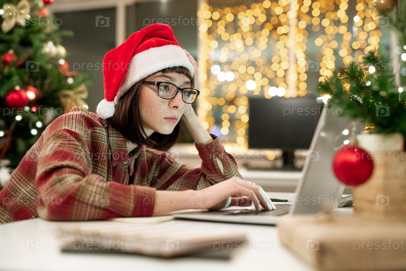 Серьезная молодая бизнесвумен в Санта-Капе сидит за столом перед ноутбуком