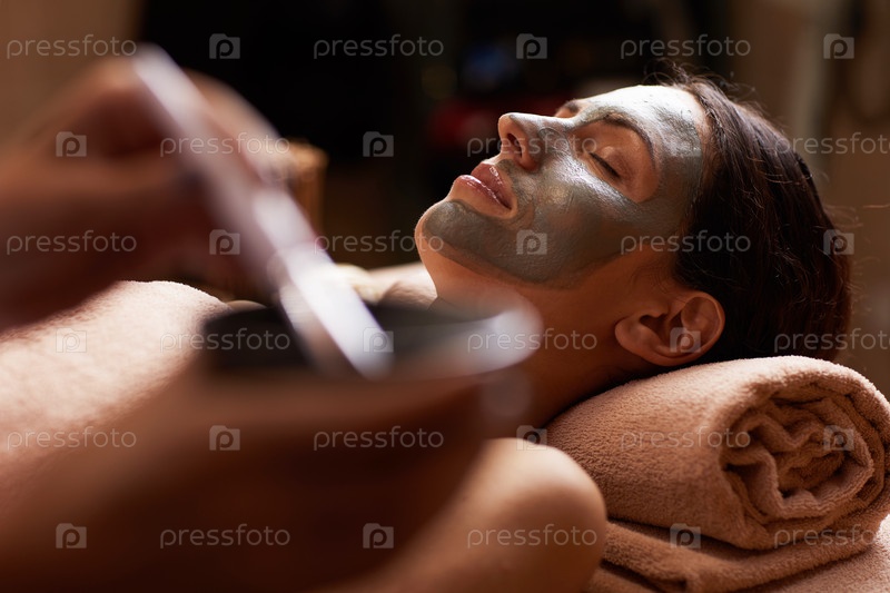 Близкий план спокойной молодой женщины с глиняной маской для лица, лежащей на прокатаном полотенце и держащей глаза закрытыми в салоне красоты