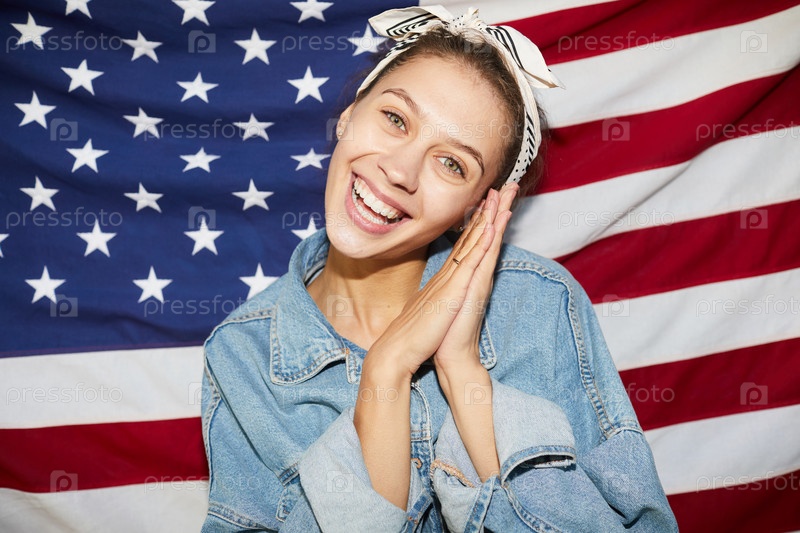 Привлекательная женщина позирует на американском флаге