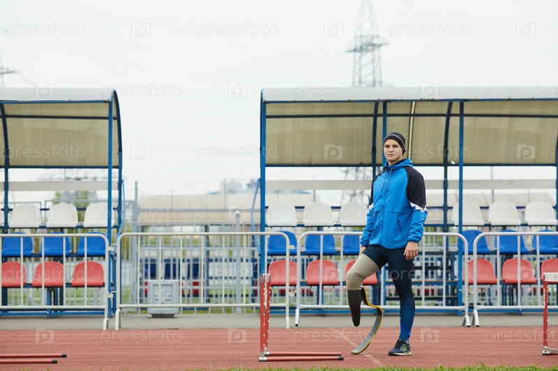 Серьезный мыслящий молодой адаптивный спортсмен в куртке, стоящий между препятствиями и смотрящий на камеру во время подготовки к гонкам с барьерами