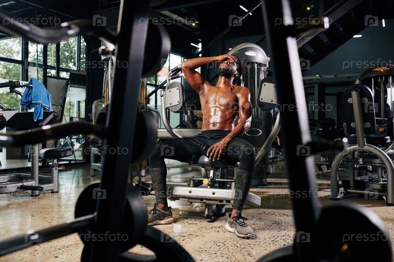 Уставший спортсмен без рубашки отдыхает в тренажерной машине