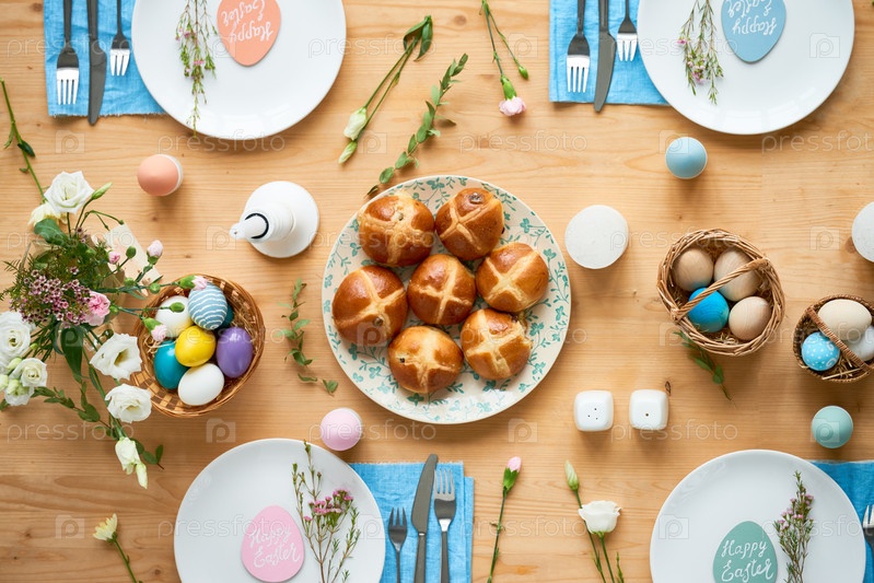 Высокоугольный вид пасхальной еды и украшений на обеденном столе с местами установки