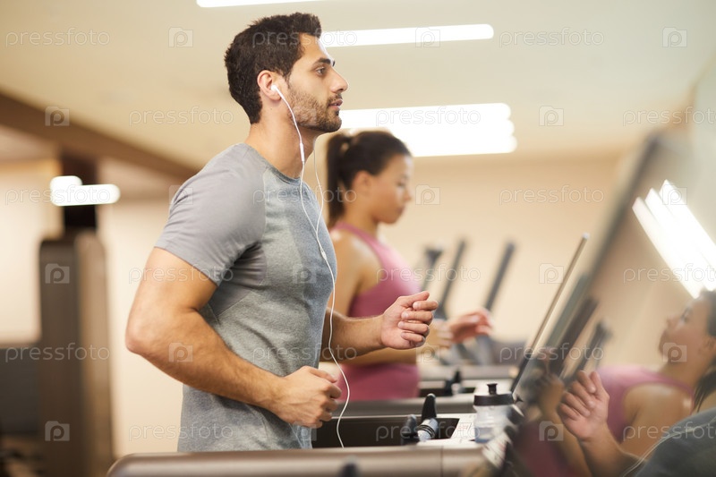 Люди, бегущие на беговых дорожках