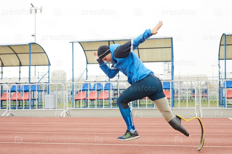 Молодой решительный паралимпийский спринтер с ампутированной ногой ниже колена размахивал руками и быстро бегал на пустом стадионе
