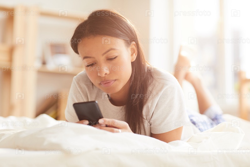 Женщина смешанной расы, использующая телефон в постели