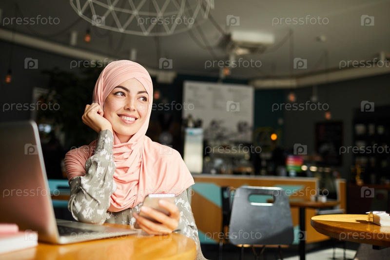 Мечтательная счастливая мусульманская женщина со смартфоном