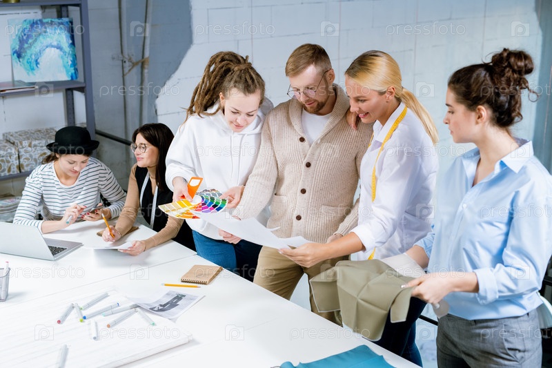 Группа креативных дизайнеров моды обсуждает цвета, текстиль и эскизы
