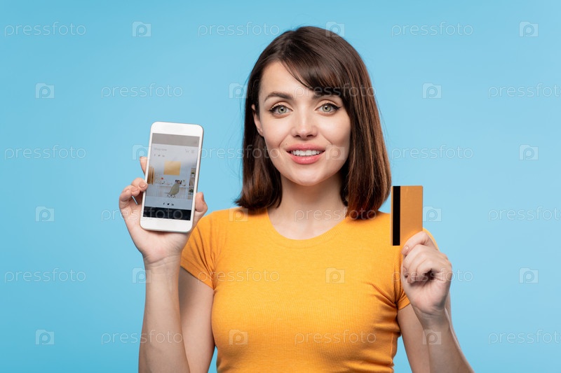 Счастливый молодой покупатель и клиент интернет-магазина с кредитной картой, показывающей вам промо