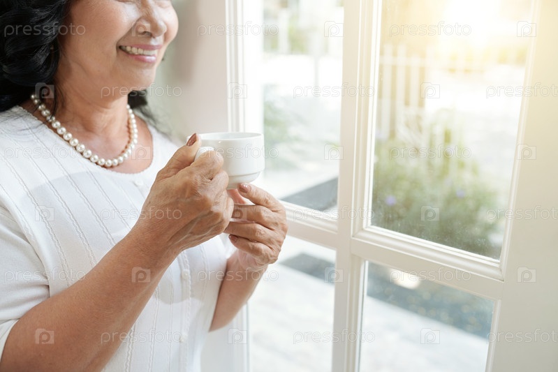 Пожилая женщина пьет кофе