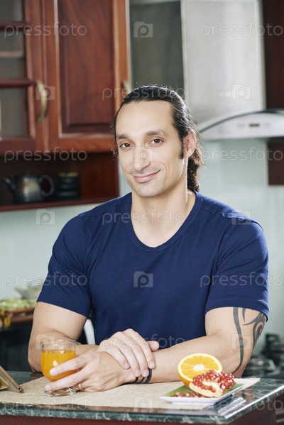 Мужчина пьет сок утром