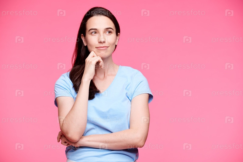 Молодая спокойная брюнетка на розовом фоне смотрит в сторону