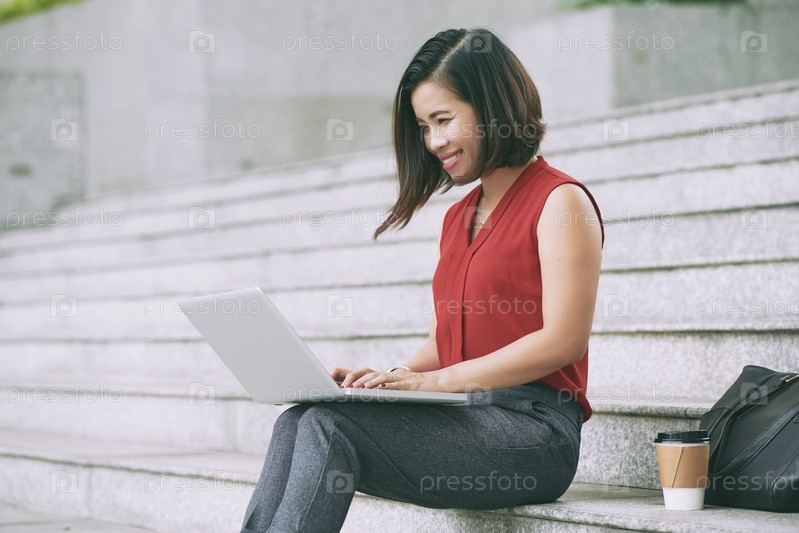 Женщина, использующая ноутбук на открытом воздухе