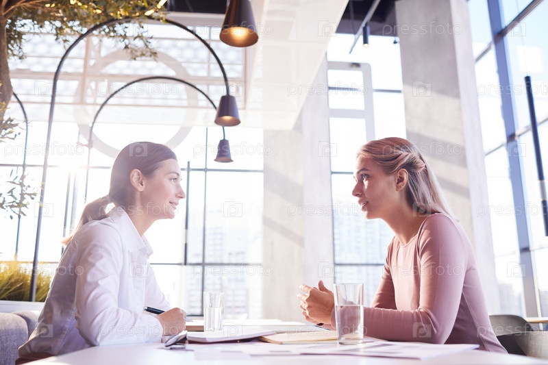 Серьезные уверенные в себе молодые деловые женщины, сидящие за столом с документами и разговаривающие друг с другом во время совместного обеда