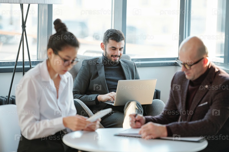 Счастливый молодой бизнесмен с ноутбуком серфирует в сети со своими коллегами поблизости