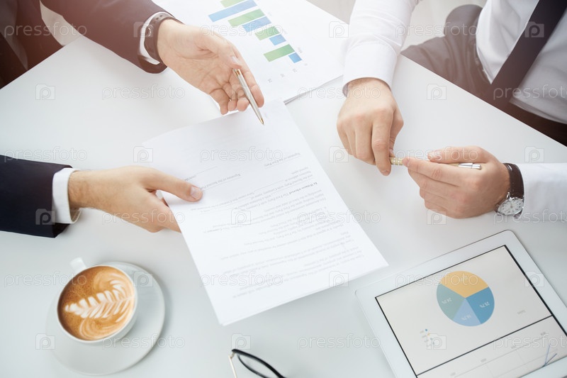 Близкий план неузнаваемого менеджера, держащего бумагу и дающего ручку клиенту, предлагая ему подписать контракт