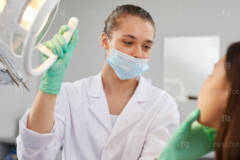 Женщина-стоматолог, осматривающая пациента