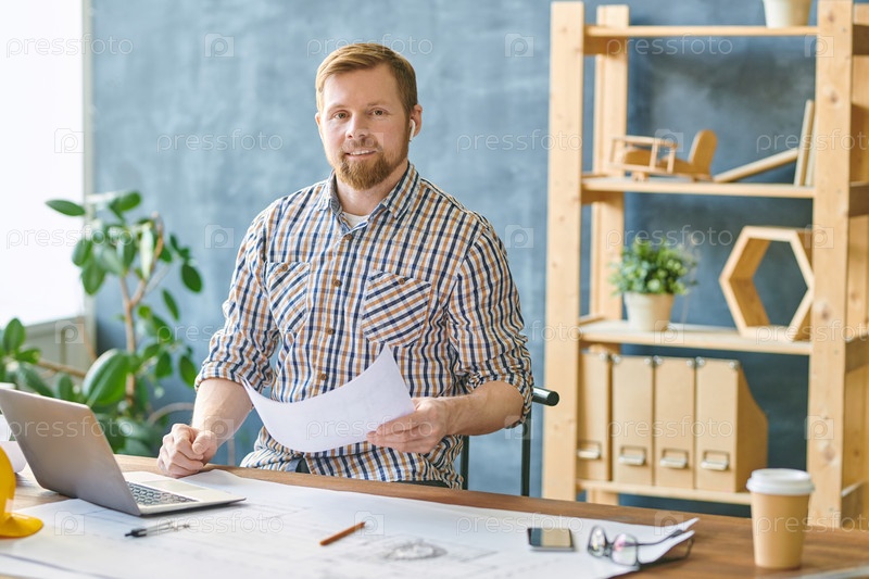 Веселый красивый молодой инженер в обычной рубашке сидит за столом и анализирует чертежи при использовании ноутбука, он смотрит на камеру