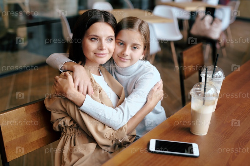 Спокойная молодая женщина и ее дочь сидят в объятиях, отдыхая в кафе