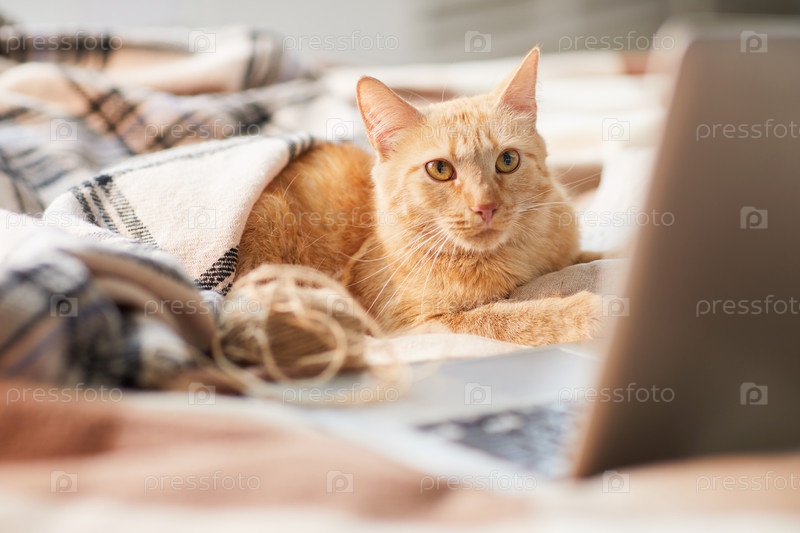 Имбирный кот использует ноутбук