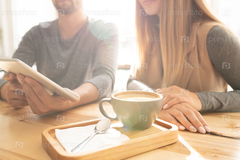 Чашка свежего капучино и ложка на деревянной подносе на фоне молодой пары