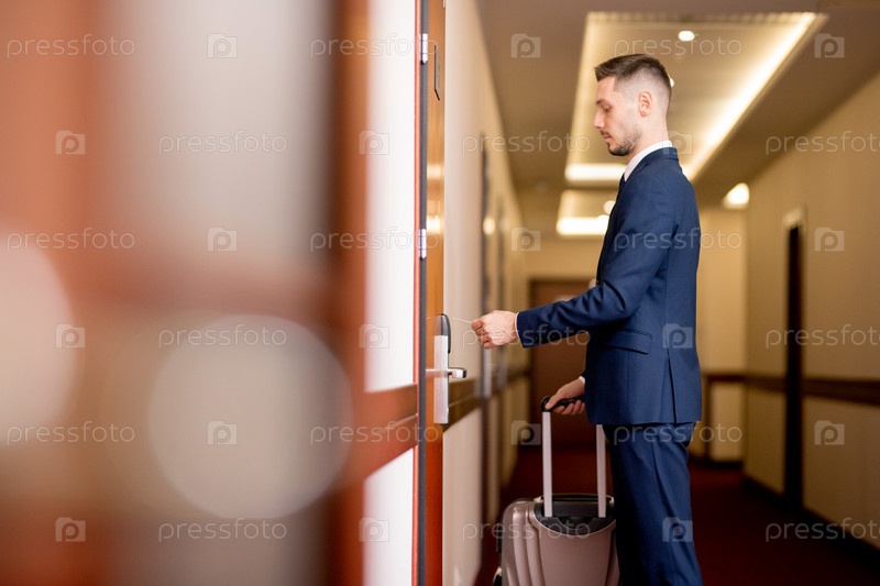 Молодой бизнесмен держит пластиковую карточку у двери, когда собирается войти в комнату