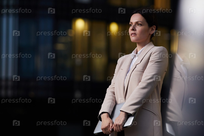 Вдумчивая красивая женщина средних лет в куртке, держащая ноутбук и стоявшая ночью снаружи, она мечтает о успешной карьере в бизнесе