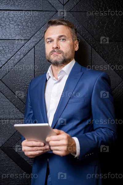 Бородатый бизнесмен средних лет, хорошо одетый с цифровым планшетом