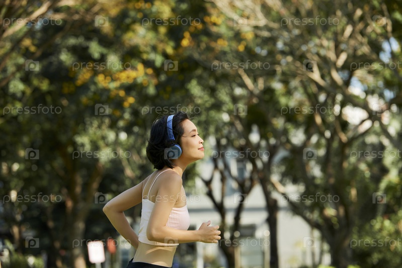 Жена-фитнесменка бегает в парке