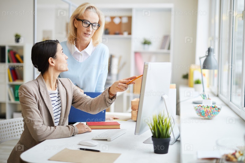 Современные дизайнеры контента в повседневной одежде обсуждают онлайн-макет на компьютере: красивая молодая женщина, указывающая на монитор и следующая советам зрелого наставника