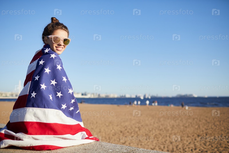 Счастливая женщина, покрытая большим американским флагом